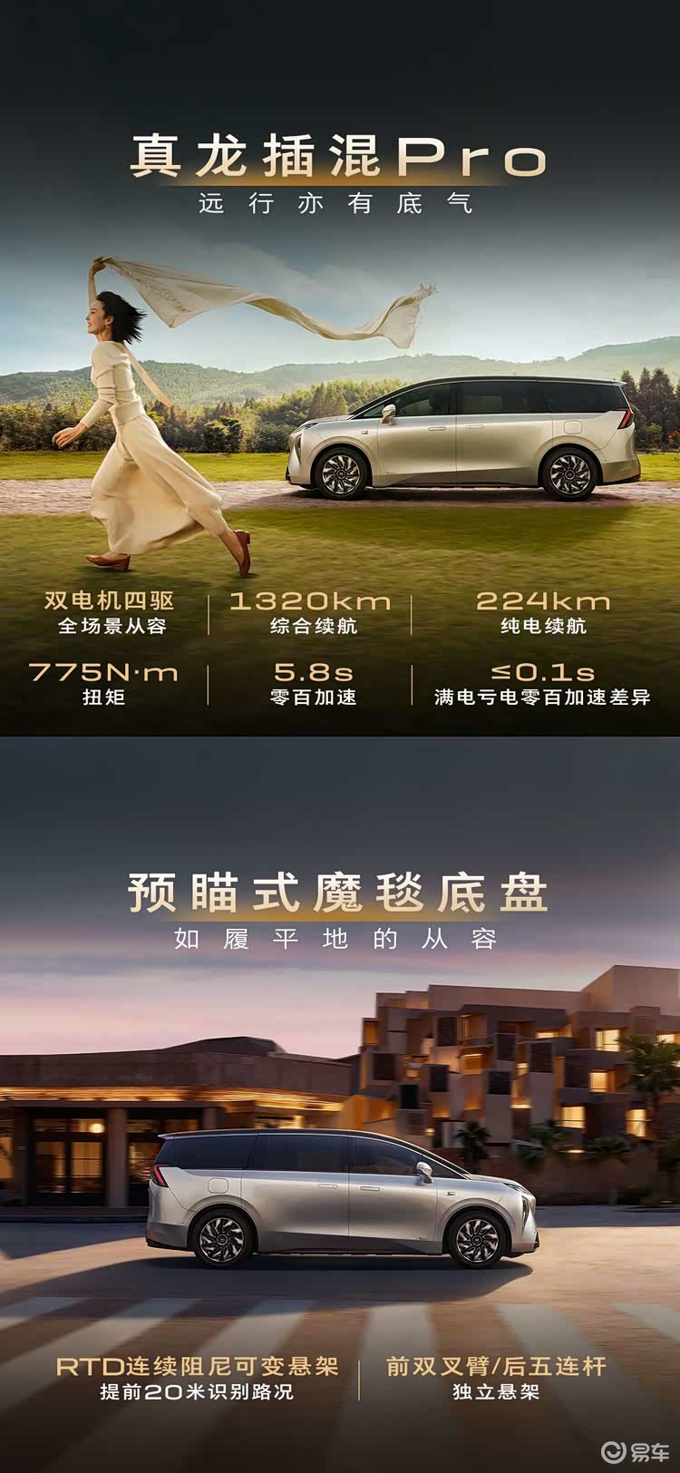 動力系統搭載“真龍”插混Pro雙電機四驅,綜合功率達462kW,零百加速僅需5.8秒。對于一臺大尺寸七座MPV而言,這樣的動力儲備足以應對滿載高速或長坡工況。CLTC綜合續航1320km、純電續航224km的組合,兼顧城市通勤的純電經濟性與長途出行的補能便利性,3C直流快充技術進一步縮短了中途充電時間。