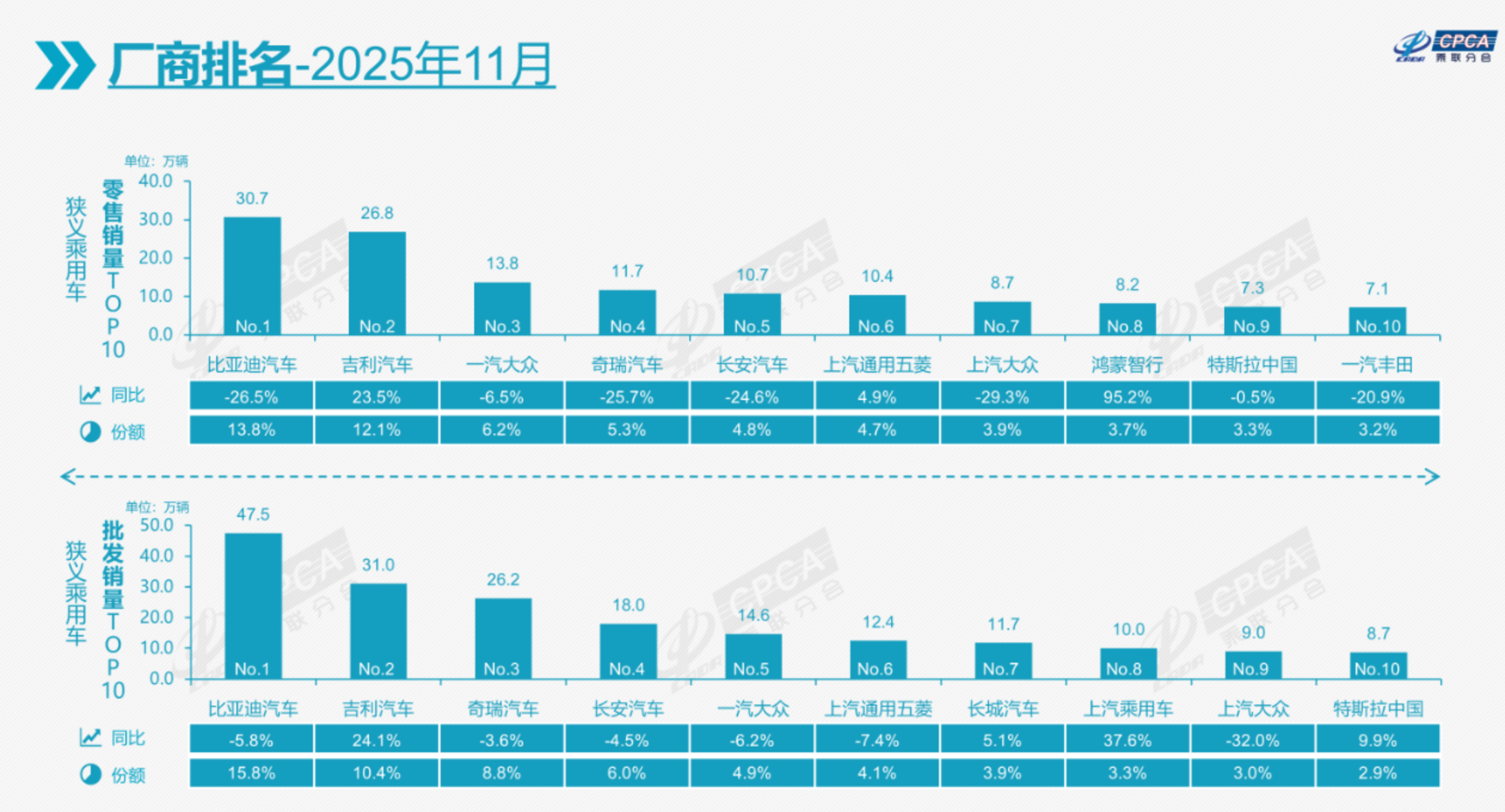 具體到品牌層面,合資品牌的表現更是參差不齊。作為德系代表的一汽-大眾,11月銷量為13.8萬輛,雖然仍排在榜單第三位,但同比下滑6.5%。而上汽大眾的下滑幅度更為明顯,11月銷量同比下滑29.3%至8.7萬輛,排名也跌至第七位。日系品牌方面,一汽豐田成為前十榜單中的“獨苗”,11月銷量為7.1萬輛,同比下滑20.9%;廣汽豐田銷量為64905輛,同比下滑3.8%;本田的表現則更為慘淡,11月銷量為50840輛,同比下降33.8%,遠超市場預期。不過,東風日產卻成為日系車企中的一股清流,11月銷量同比增長7.9%,成為唯一保持上漲的日系品牌。