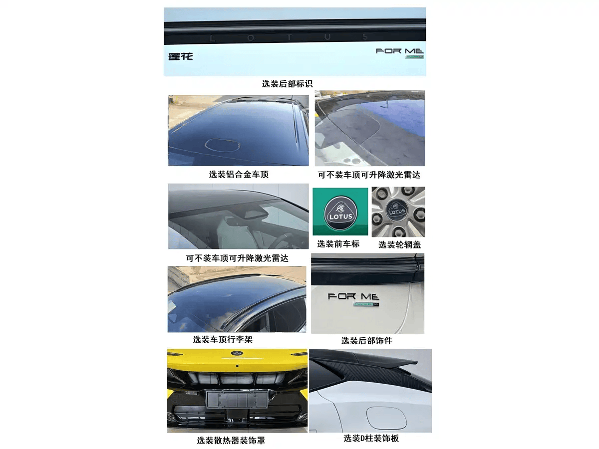 從申報信息中我們可以了解到,蓮花FOR ME在配置上相當豐富。車輛將提供升降激光雷達、行李架、多種輪圈選擇、制動卡鉗以及電動拖車鉤等實用配置,滿足了消費者對于個性化與實用性的雙重需求。