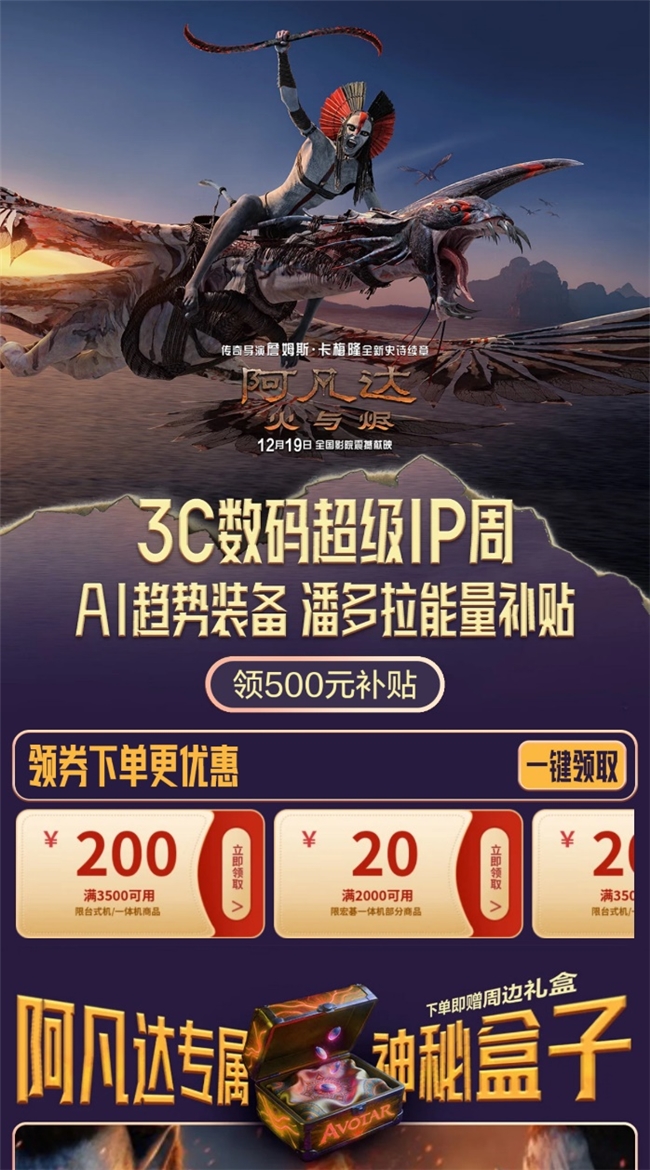 值得關注的是,京東還推出數碼潮電專屬福利,眾多趨勢尖貨低至5折,消費者下單投影儀類等阿凡達專屬盒子即可獲贈電影周邊,華為、小米、蘋果等手機、筆記本、耳機等AI裝備限時低價秒殺,讓消費者以更劃算的價格升級設備,重溫《阿凡達》系列的震撼視覺效果。