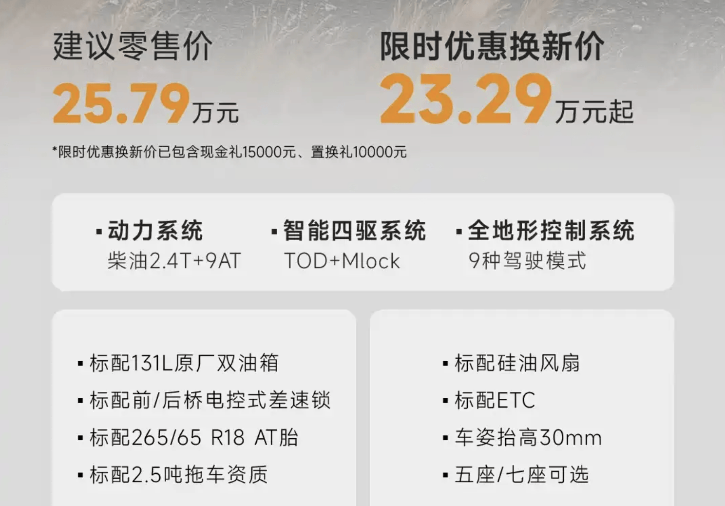 動力系統延續現款2.4T柴油發動機配置,最大功率137kW,峰值扭矩490N·m,匹配9速自動變速箱。續航能力方面,131L原廠雙油箱設計使滿油續航里程突破1400公里。四驅系統采用博格華納TOD適時四驅,提供標準、經濟、運動、雪地、泥地、沙地、4L、巖石、專家共9種駕駛模式,其中巖石模式與專家模式為新增選項。車輛具備2.5噸拖車資質,進一步拓展使用場景。