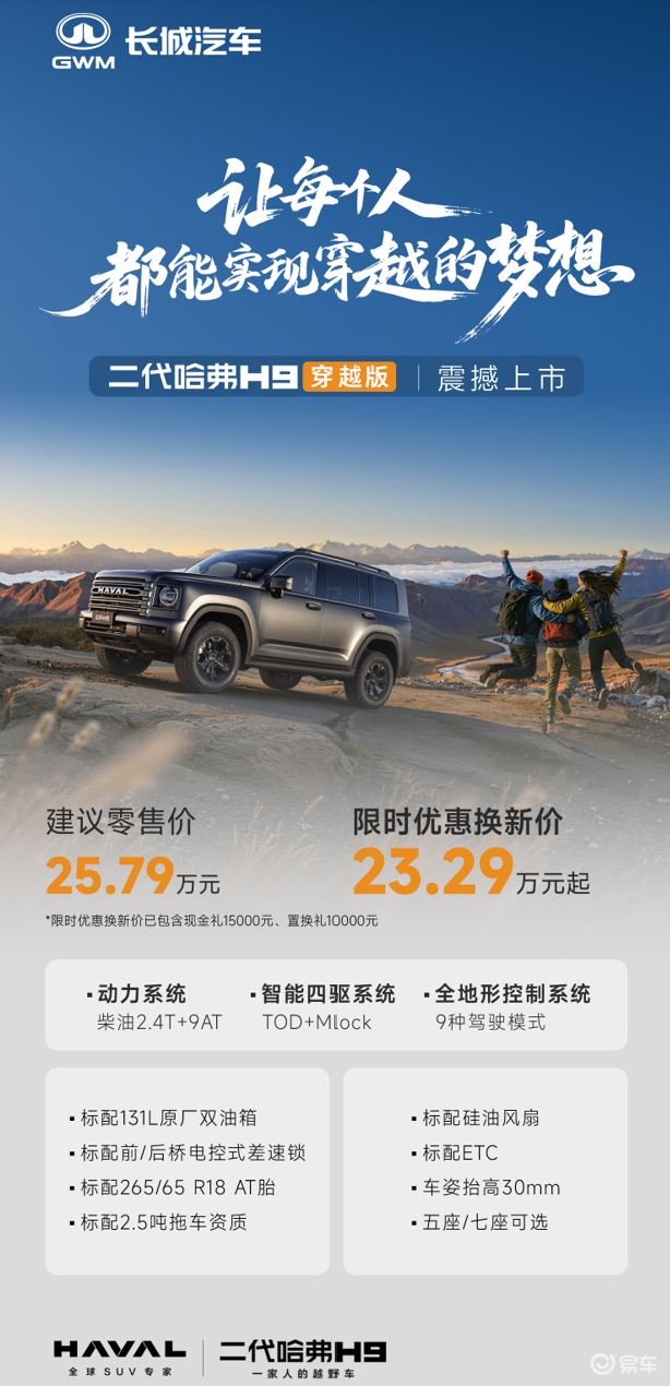 在專業(yè)配置方面,二代哈弗H9穿越版全系標(biāo)配“三把鎖”(前/后橋電控差速鎖+TOD+Mlock四驅(qū)系統(tǒng))、265/65R18 AT越野輪胎,新增巖石與專家模式后共提供9種駕駛模式,車姿抬高30mm使最小離地間隙達(dá)235mm,并自帶2.5噸牽引資質(zhì),可拖拽房車或UTV等裝備。這些曾專屬于高端越野車的配置,如今成為普通消費者的標(biāo)配福利。