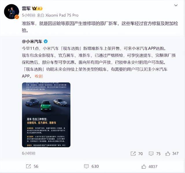 針對準新車的具體定義,小米集團董事長雷軍通過社交平臺解釋稱,這類車輛主要因物流運輸過程中產生的輕微損傷,經原廠專業修復并完成附加檢測后重新投放市場。所有修復流程均遵循官方標準,確保車輛性能與全新車保持一致,同時提供與全新車同等的售后服務保障。