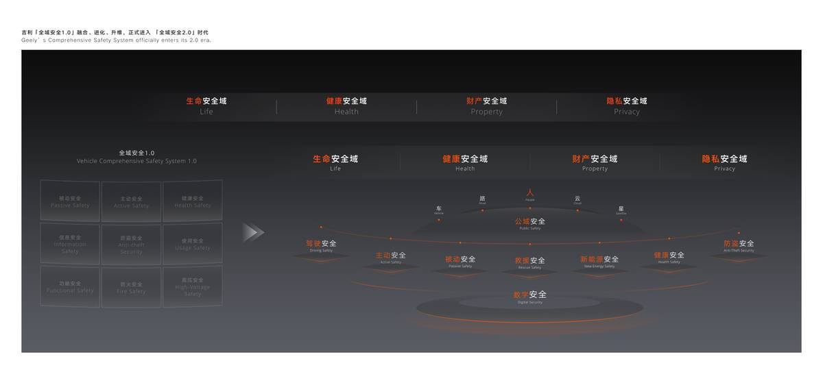 “全域安全2.0”技術(shù)體系是吉利在“全域AI”技術(shù)賦能下的全面升級(jí)。該體系將安全視角從“整車安全”擴(kuò)展至“人-車-路-云-星”生態(tài)視角,貫穿用戶出行全場(chǎng)景,覆蓋出行全領(lǐng)域。技術(shù)體系以“生命零傷亡、健康零危害、財(cái)產(chǎn)零損失、隱私零泄露”四大愿景為指引,將原有的九大安全系統(tǒng)迭代升級(jí)為駕駛安全、主動(dòng)安全、被動(dòng)安全、救援安全、健康安全、新能源安全、防盜安全、數(shù)字安全、公域安全九大領(lǐng)域。其中,“公域安全”為首次納入,旨在通過技術(shù)共建、標(biāo)準(zhǔn)共建和行業(yè)生態(tài)聯(lián)盟共建,提升道路交通安全和全球生態(tài)健康。