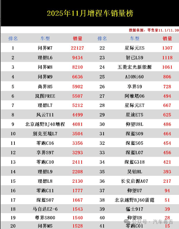曾經被視為過渡性技術的增程式電動汽車,如今正以驚人的速度闖入主流消費市場,成為越來越多購車者的首選。最新公布的零售數據顯示,2025年11月增程車型銷量榜單中,共有42款車型上榜,這一數字不僅刷新了歷史紀錄,更折射出市場格局的深刻變化——從新勢力品牌到傳統車企,各方勢力正圍繞這條技術路線展開激烈角逐。