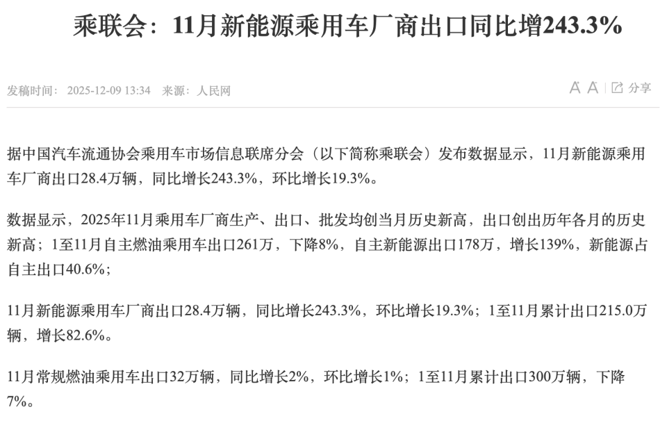 近期發布的數據進一步印證了這一趨勢。工信部主管的《中國工信新聞網》援引乘聯會數據稱,2025年11月,中國新能源乘用車廠商出口量達28.4萬輛,同比增長243.3%,環比增長19.3%。相比之下,同期常規燃油車出口量為32萬輛,同比增長2%,環比增長1%。兩者差距已縮小至不足4萬輛,新能源汽車出口量有望在12月超越燃油車。若這一趨勢持續,中國不僅將繼續穩居全球汽車出口第一大國,新能源汽車在國內市場的滲透率也將進一步攀升,逐步取代燃油車的主導地位。