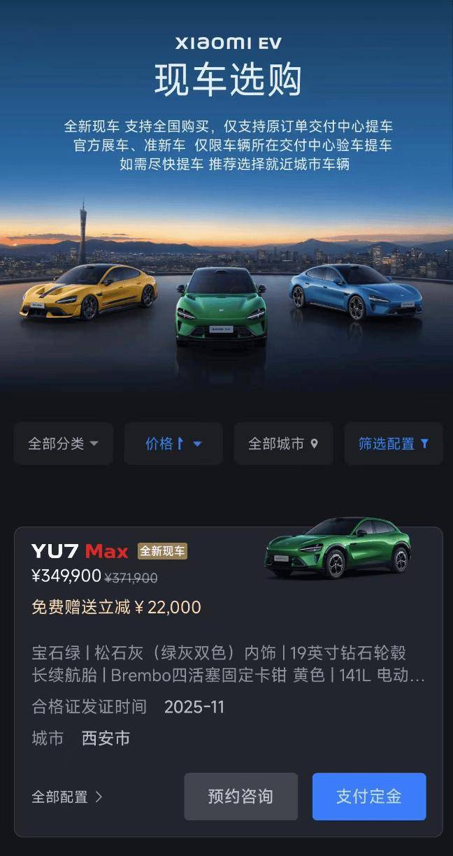 此次上架的現車以YU7和SU7頂配版本為主,售價普遍超過30萬元。為吸引消費者,大部分車型參與立減22000元的優惠活動。現車選購服務支持快速提車,并提供完整的原廠質保和售后服務。已鎖單但尚未交付的用戶,可根據需求調整配置。