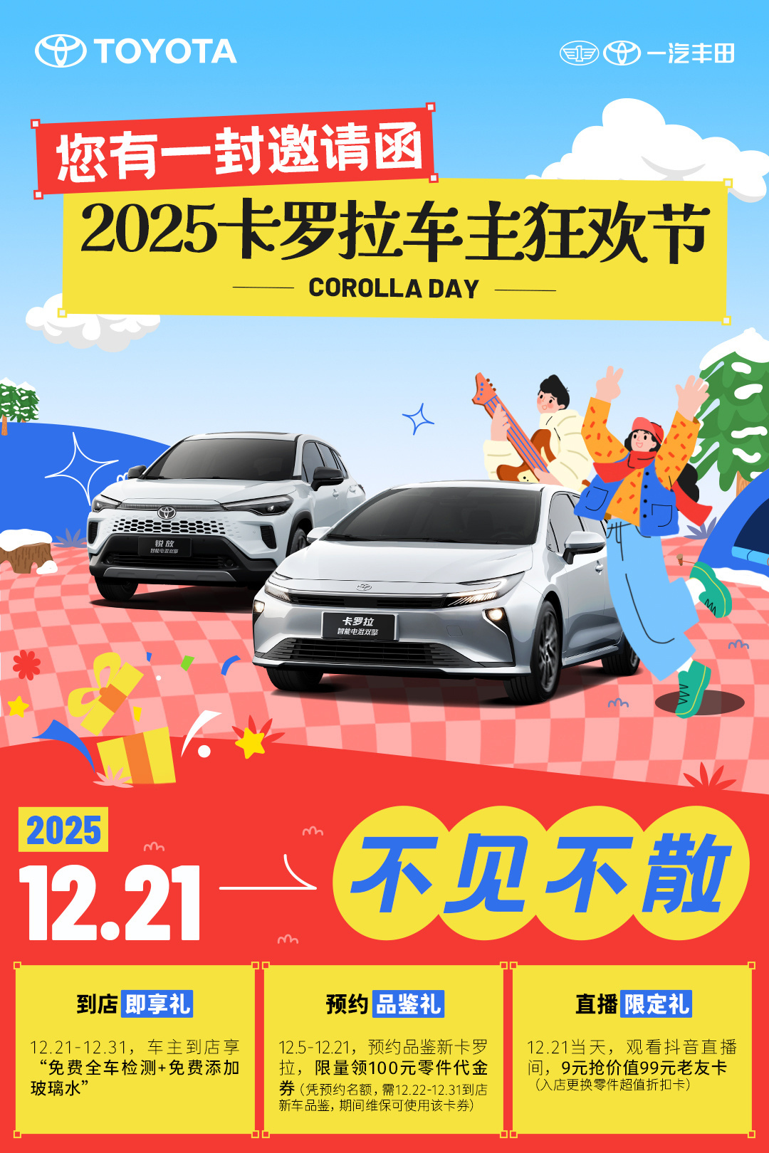 一汽豐田近日宣布,將于12月21日舉辦2025卡羅拉車主狂歡節(jié)活動(dòng)。據(jù)此前消息,新款卡羅拉計(jì)劃在12月正式上市,此次活動(dòng)極有可能成為新車發(fā)布的重要場合。