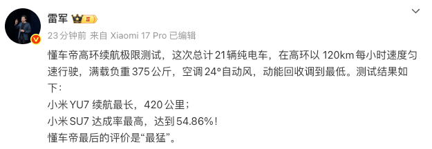 懂車帝續航測試揭曉:小米SU7達成率居首,YU7續航里程領跑同組