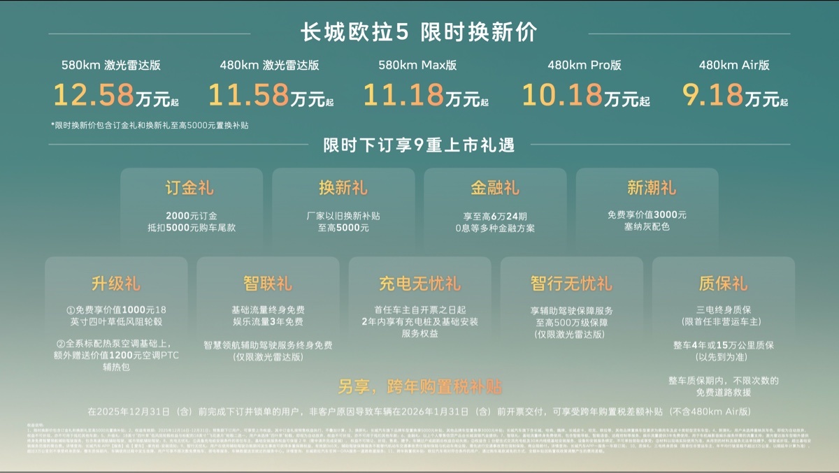 長城汽車近日正式推出全新純電SUV歐拉5,瞄準年輕消費群體,主打城市通勤場景。新車共發布五款配置,限時換新價區間為9.18萬至12.58萬元,憑借復古設計語言與智能化配置引發市場關注。