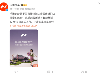 樂道汽車正式揭曉了旗下中型SUV——樂道L60紫羅蘭版的官方圖片,這一限量版車型的發布引起了市場的廣泛關注。據悉,樂道L60紫羅蘭版將僅限量發售666臺,并計劃于次日,即12月18日正式上市,同時開啟交付工作。目前,這款新車已陸續抵達各地經銷商門店,供消費者近距離觀賞與體驗。