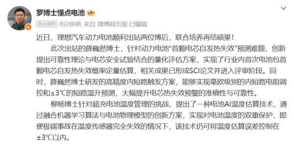 理想汽車動力電池領域近日傳來喜訊,兩位聯合培養的博士后順利完成研究任務出站,標志著該企業在高端人才培養與技術創新方面再獲突破。此次出站的薛巍然、柳楊兩位博士在站期間聚焦行業痛點,分別在電池安全評估與溫度管理領域取得重要成果。