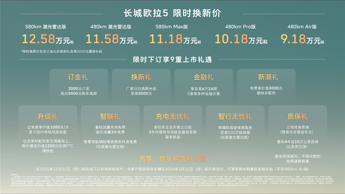 今日,長城汽車旗下歐拉品牌全新A級純電SUV——長城歐拉5正式登陸市場。新車推出5款不同配置,建議零售價區(qū)間為9.98萬至13.38萬元,限時換新價9.18萬元起(包含“訂金禮”與“換新禮”至高5000元以舊換新補貼)。即日起至2025年12月31日,用戶下訂并鎖單即可享受包含訂金禮、換新禮、智行無憂禮在內(nèi)的9重上市好禮,以及跨年購置稅補貼(不含480km Air版)等購車權(quán)益。憑借極具競爭力的價格與越級產(chǎn)品力,長城歐拉5旨在成為全球年輕用戶的出行“嚴選搭子”。