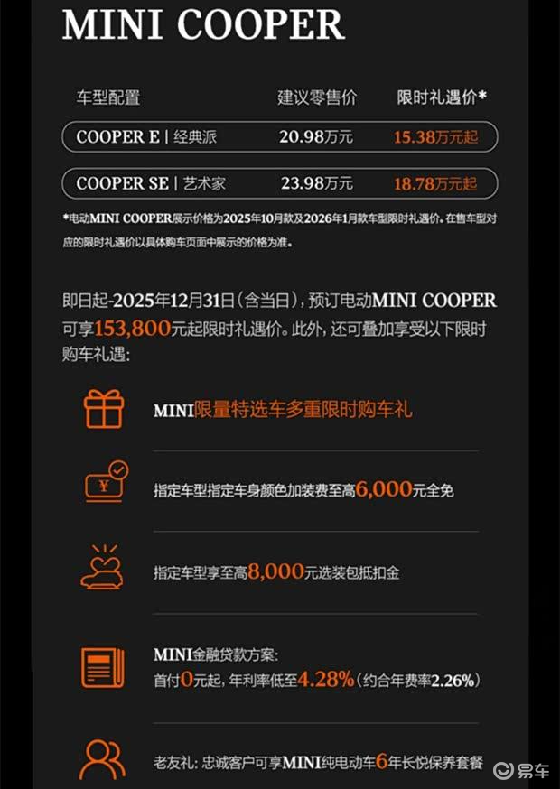 MINI品牌近日正式面向市場推出2026款電動MINI COOPER,以兩款不同配置車型開啟電動化新篇章。官方指導(dǎo)價設(shè)定為20.98萬元與23.98萬元,同步開啟的限時禮遇活動將價格下探至15.38萬元及18.78萬元,為消費者提供更具吸引力的購車選擇。