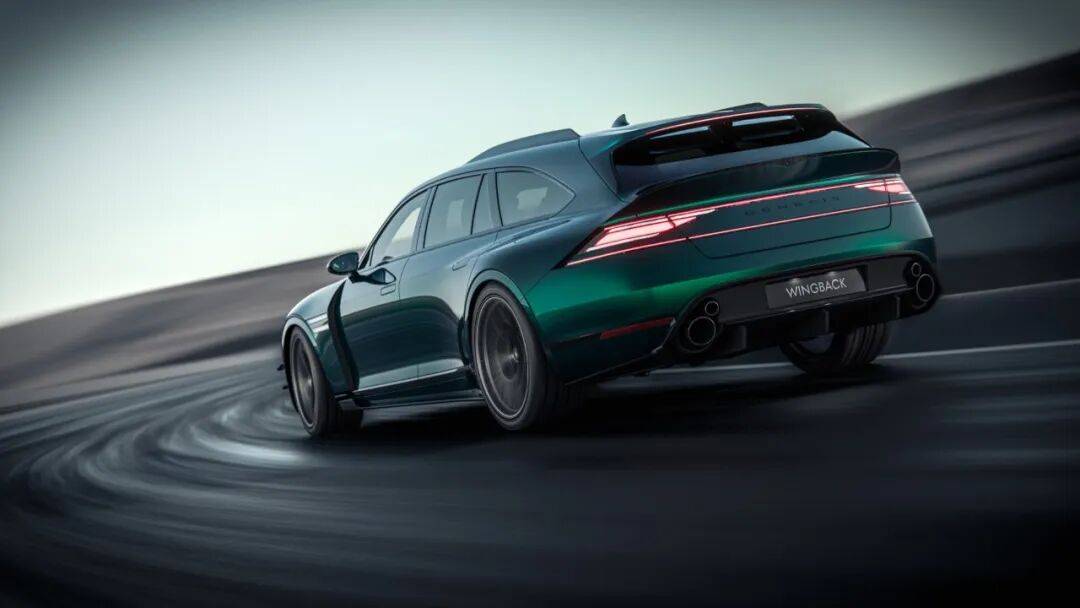 從側面看,車頂線條經過精心雕琢,延伸出流暢的大型旅行車輪廓,既保留了G90長軸距的優勢,又在后端增加了一對擾流翼片,與“Wingback”的命名相呼應。尾部設計同樣出彩,傾斜角度明顯的后窗由雙擾流板勾勒,搭配性能取向的后擴散器和雙邊四出大小排氣管,兼具實用性與美感。