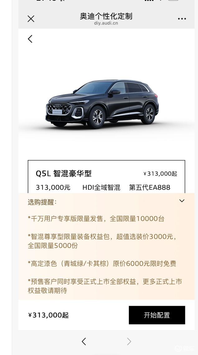 此次預售策略堪稱"組合拳":智混豪華型以31.3萬元起售,疊加"限量1萬臺+配置禮包立減3000元"的限時優惠,甚至將青境綠、卡其棕等高端車漆納入免費選項。產品層面,基于全新平臺打造的Q5L搭載HDI全域智駕系統與第五代EA888發動機,實現從智能駕駛到動力性能的全面革新。更打破行業慣例的是,預售階段即開放全系配置選裝,消費者無需等待低配車型逐步退市,即可直接享受滿配權益。