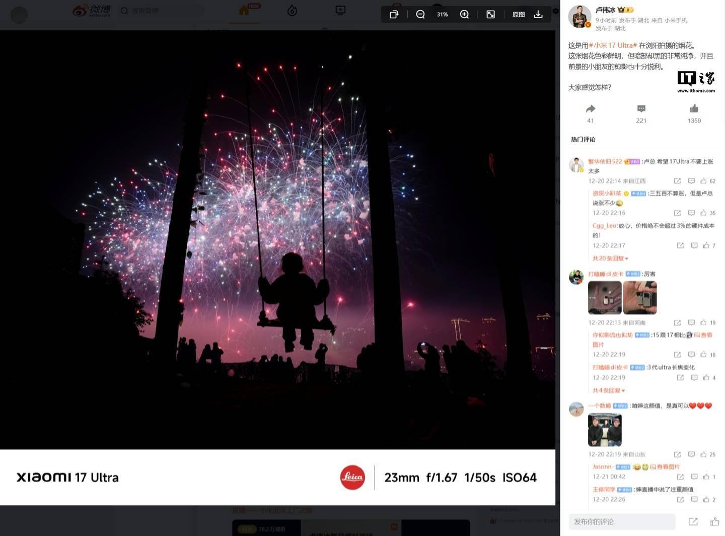 小米集團合伙人、總裁兼手機部總經理盧偉冰近日在社交平臺分享了小米17 Ultra手機的首張實拍樣張。這張由新機在瀏陽拍攝的煙花照片引發關注,畫面中綻放的煙花色彩飽和度極高,暗部區域卻呈現出深邃純凈的黑色,前景中孩童的剪影輪廓清晰銳利,整體成像效果展現出專業攝影設備的質感。