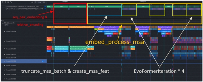 MindSpore 支持用戶使用 Profiler 類對模型的性能進行采集,所獲得的 Profiling 數據記錄了詳細的算子時間線,也包括了算子的顯存占用信息。Profiling 數據可以通過 MindInsight 工具進行可視化分析,可以查看詳細的算子時間線,以及流之間的調用關系。我們可以精確計算出每個模塊的位置及其耗時,并據此來確定這些模塊是否需要進一步的優化。例如,下圖展示了我們對推理過程中 PairFormer 模塊的定位與拆解,為后續的時間、內存的分析提供了框架與引導:
