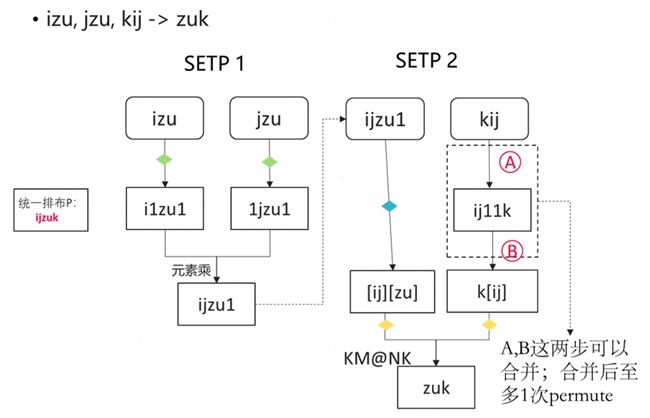Einsum 高效實現在邏輯上離不開對下標的重排列(permute)。但 permute 操作的時間復雜度是 O(N),我們可以通過優化下標排布,減少或消除顯式的 permute 操作,來進一步提升 Einsum 的算子性能。具體操作包括: