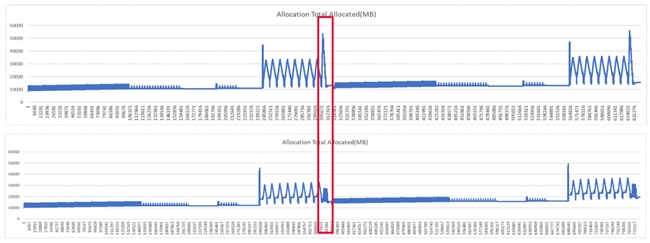如下圖紅框處所示,a 為未優化前顯存占用曲線,可以看到在紅框處達到峰值。通過分析可以確定此處位置用于計算 smooth_lddt_loss,因此將這個部分單獨進行重計算后就得到了下圖的結果,此處峰值由 55G 下降到 20G 以內。