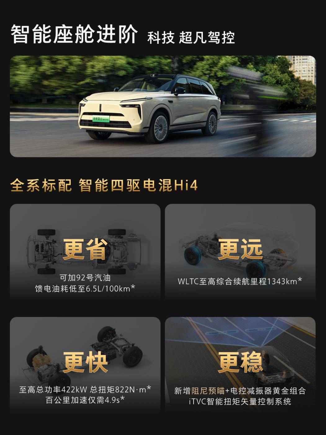 在動力系統方面,全新藍山智能進階版搭載了Hi4性能版智能四驅電混技術。這一技術借鑒了“都江堰”的智慧,通過智能調度實現全場景的省、遠、快、穩。Hi4性能版是全球首創的四擋全速域直驅技術,零百加速僅需4.9秒,饋電油耗低至6.5L/100km,綜合續航可達1343km。前后50:50的軸荷分配和iTVC智能扭矩控制,為全家出行提供了從容安穩的駕乘體驗。