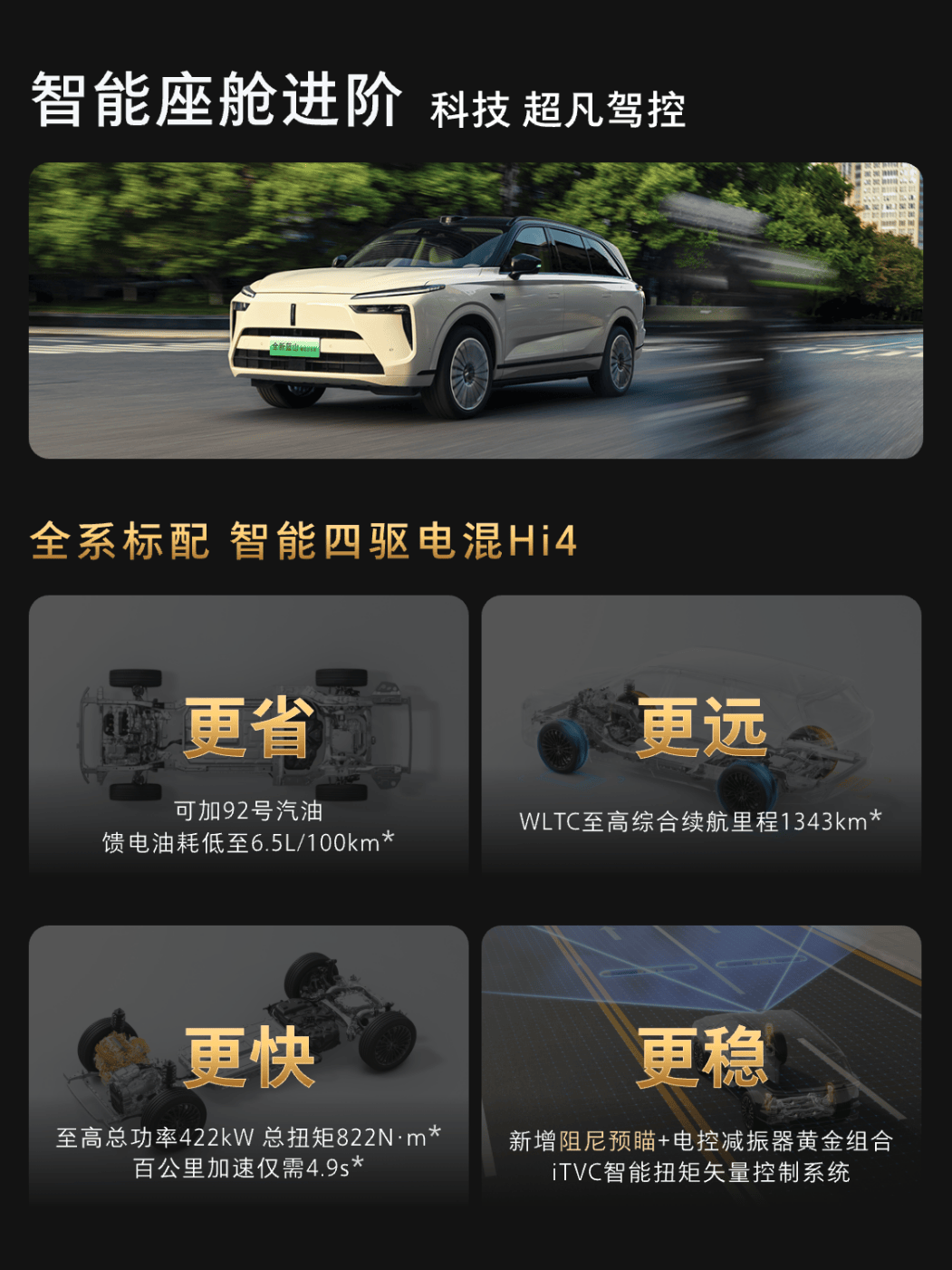 在動力系統方面,全新藍山智能進階版搭載Hi4性能版智能四驅電混技術,以“都江堰智慧”實現全場景的省、遠、快、穩。Hi4性能版是全球首創的四擋全速域直驅技術,具備4.9秒零百加速性能,同時實現6.5L/100km的超低饋電油耗和1343km綜合續航。前后50:50軸荷分配與iTVC智能扭矩控制技術,為全家出行提供安穩的駕乘體驗,真正實現“四驅的性能,兩驅的花費”。車輛還升級了底盤阻尼預瞄功能,提前感知路面減速帶并調整懸掛軟硬,提升出行舒適性。