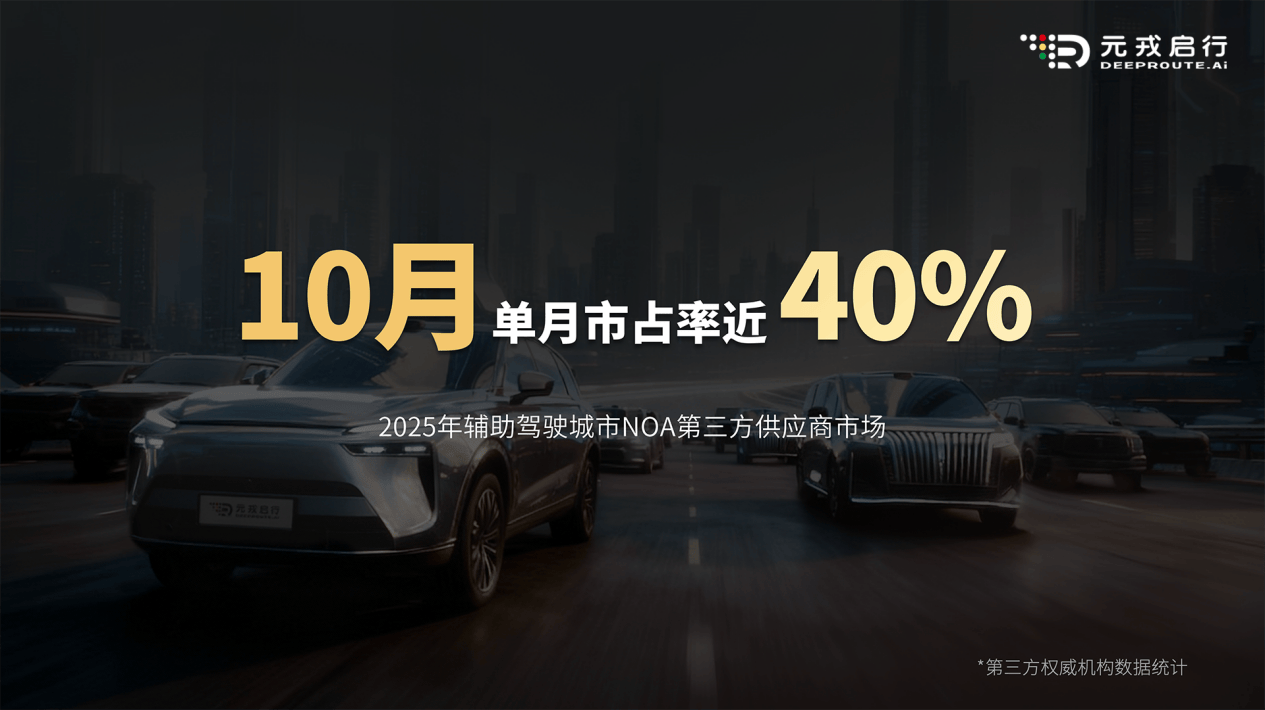 支撐技術落地的背后是元戎啟行成熟的工程化體系。數據顯示,截至2025年10月,該企業已向市場交付20萬輛搭載城市NOA(領航輔助駕駛)系統的量產車型,合作范圍覆蓋SUV、MPV、越野車等主流細分市場。第三方權威機構統計表明,其輔助駕駛方案在當月城市NOA供應商市場份額中占比近四成,展現出強勁的市場競爭力。