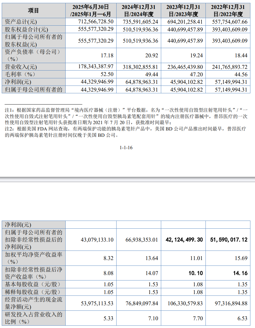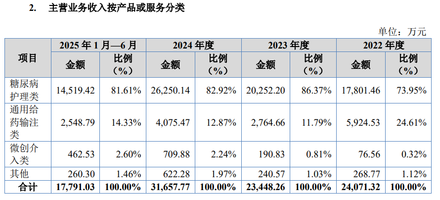 財務數(shù)據(jù)顯示,2022年至2025年上半年,公司營業(yè)收入分別為2.42億元、2.36億元、3.18億元和1.78億元,凈利潤分別為5715萬元、4590.41萬元、6487.9萬元和4432.99萬元。其中,糖尿病護理類產(chǎn)品貢獻了主要收入,報告期內(nèi)占比持續(xù)保持在73%以上,2025年上半年仍達81.61%。該類產(chǎn)品收入從2022年的1.78億元增長至2024年的2.63億元,2025年上半年實現(xiàn)1.45億元,展現(xiàn)出穩(wěn)健的增長態(tài)勢。