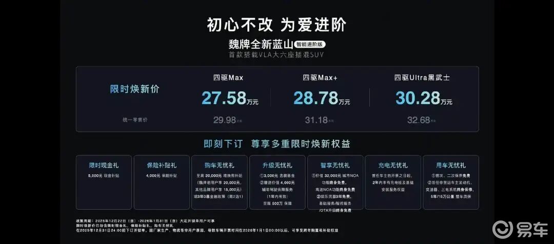 長城汽車旗下魏牌迎來重要時刻——全新藍山智能進階版正式上市,指導價29.98萬元起,限時優惠后價格為27.58萬元起。這款新車不僅是長城首款搭載VLA(Vision-Language-Action)大模型的量產車型,更是行業內首款配備該技術的大六座插混SUV,標志著長城在智能駕駛領域邁出了關鍵一步。