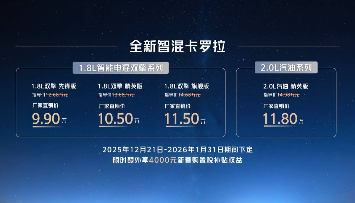 “全球好品質(zhì) 中國新家轎”——全新智混卡羅拉近日正式登陸市場,推出四個版本,廠商指導價區(qū)間為9.9萬元至11.8萬元。即日起至1月31日,消費者下訂即可享受限時4000元新春購置稅補貼,為家庭購車增添更多實惠。