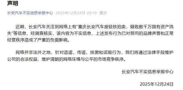 近日,長安汽車不實信息舉報中心對外發布重要聲明,針對近期網絡上流傳的一則不實消息進行辟謠。該消息聲稱“重慶長安汽車廢輕鐵拍賣,疑致數千萬國有資產流失”,長安汽車在聲明中明確指出,經詳細調查核實,此類內容純屬虛構,與事實嚴重不符。