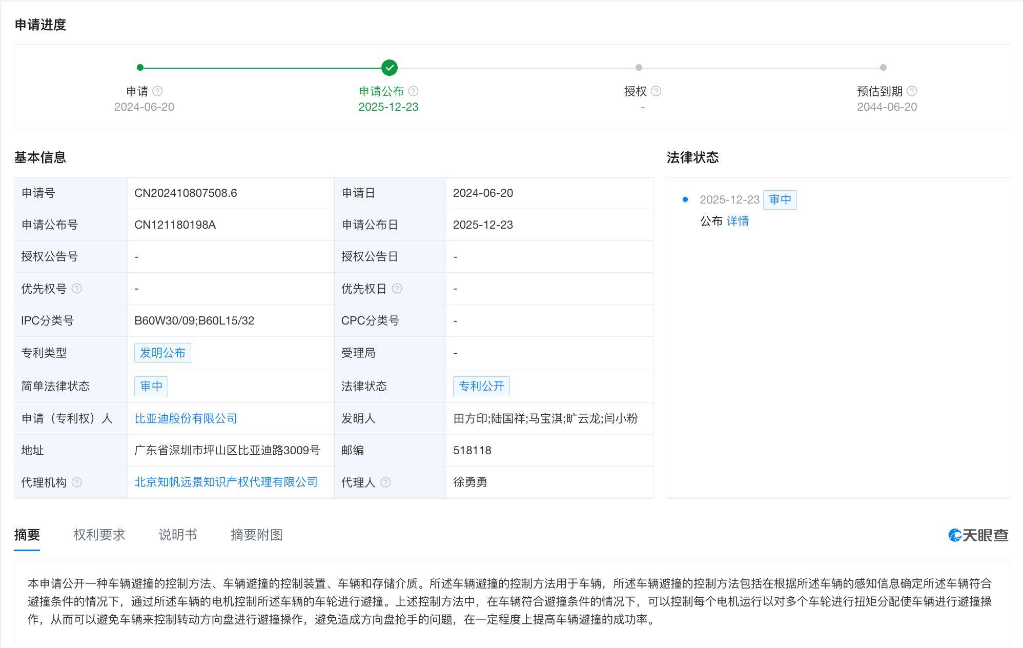 近日,國家知識產(chǎn)權(quán)局公布了一項由比亞迪股份有限公司申請的專利——“車輛避撞的控制方法和控制裝置、車輛及存儲介質(zhì)”。這項創(chuàng)新技術(shù)聚焦于提升車輛在復(fù)雜路況下的主動安全性能,為自動駕駛及輔助駕駛領(lǐng)域帶來新的解決方案。