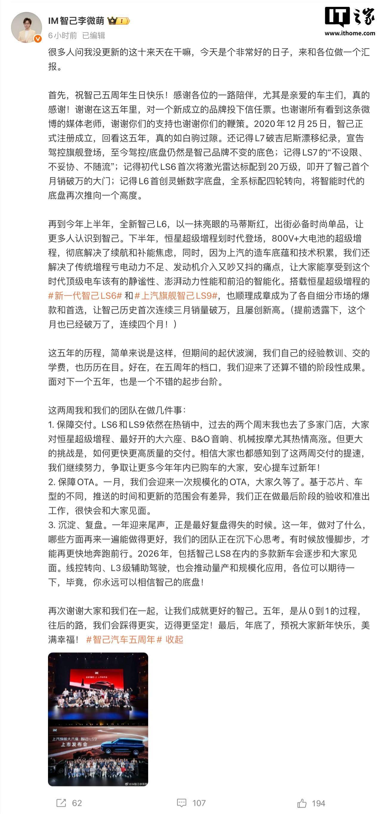智己汽車CMO李微萌近日通過社交平臺(tái)透露,品牌將于2026年推出包括智己LS8在內(nèi)的多款全新車型,同時(shí)加速線控轉(zhuǎn)向技術(shù)與L3級(jí)輔助駕駛系統(tǒng)的量產(chǎn)落地。這一消息引發(fā)行業(yè)對(duì)智能駕駛技術(shù)規(guī)模化應(yīng)用的廣泛關(guān)注。